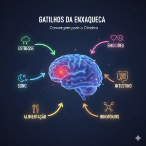 A fisiopatologia da enxaqueca envolve ativação do sistema trigeminovascular, liberação de neuropeptídeos inflamatórios, alterações na excitabilidade neuronal e desequilíbrios metabólicos. Estresse crônico, distúrbios do sono, flutuações hormonais, disfunções intestinais e hábitos alimentares inadequados podem atuar como gatilhos ou perpetuadores das crises.